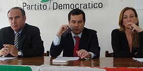 Nella foto: Mario Bruno, capogruppo Pd, Silvio Lai, segretario regionale, e Alessandra Giudici, candidata alla riconferma di palazzo Sciuti