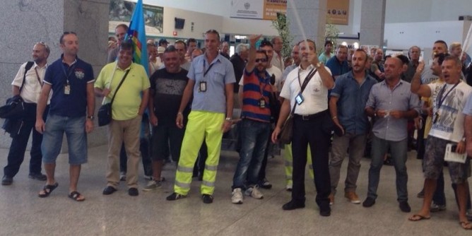 Nella foto: lavoratori scioperano all'interno dello scalo