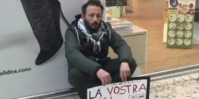 Con un cartello dove ha scritto: "la vostra crisi non la paghiamo noi" Luigi Puggioni protesta da mercoledì nello scalo algherese contro il licenziato da parte della Sogeaal