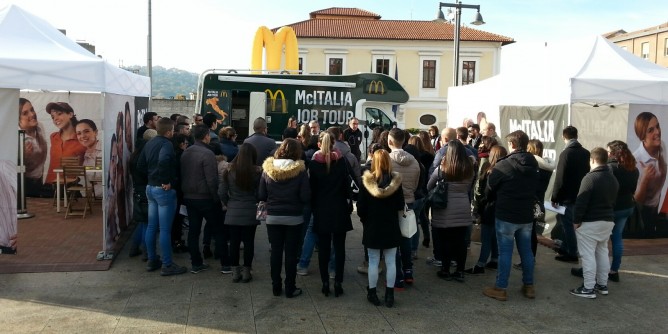 Il Villaggio McDonals´s è stato allestito in Piazza Vittorio Emanuele, dove, fino alle ore 18, sono in programma i colloqui dei candidati che hanno superato il test on-line